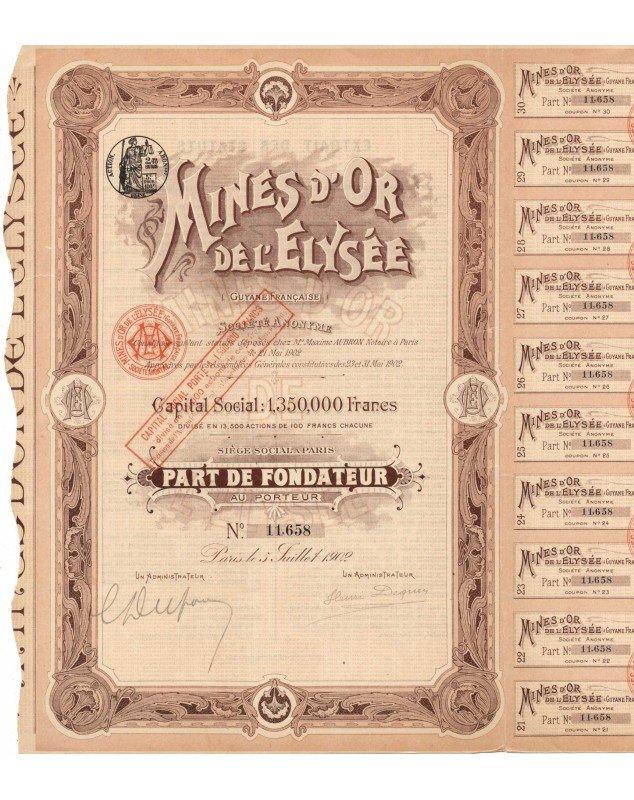 Part de Fondateur émise à Paris en 1902, avec tampon d'augmentation de capital à 1.500.000 francs.