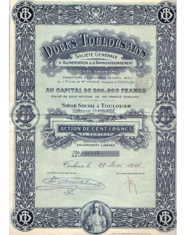 Action de 100 francs au porteur émise à Toulouse en 1914.