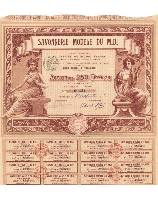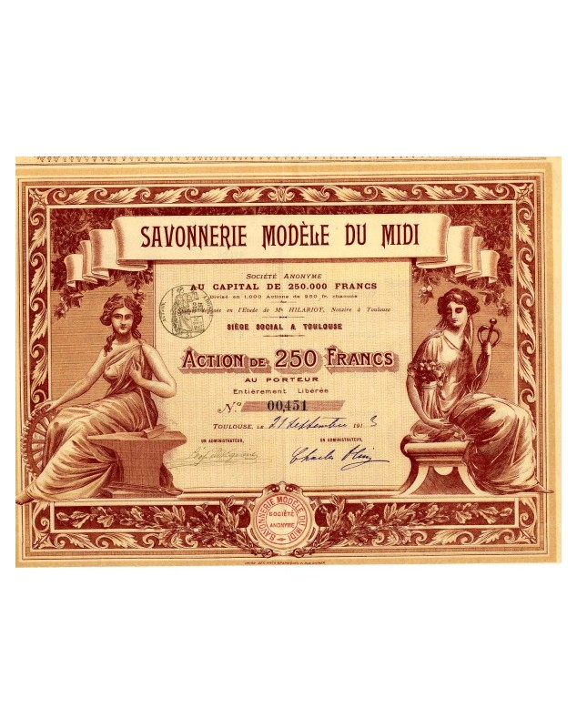 La société fut créée en 1909 par Léopold Viguerie (signature sur le titre), négociant à Toulouse, pour exploiter une usine de fabrication de savon blanc cuit sur lessive, dit savon de Marseille.