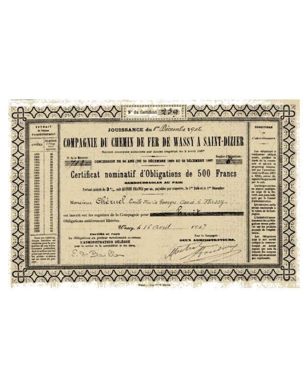 Certificat nominatif d'Obligations de 500F - Wassy 1907