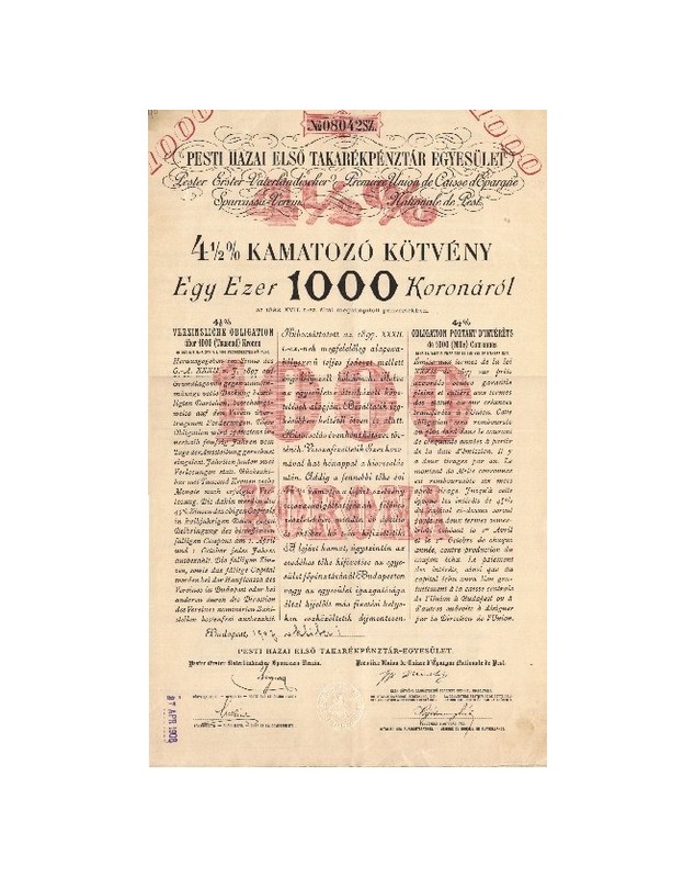 Première Union de Caisse d'Epargne Nationale de Pest - 4,5% 1000Kr