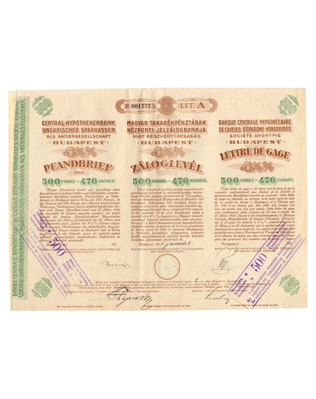 Lettre de Gage 4,5% de 500F/476 Kr - Budapest 1911