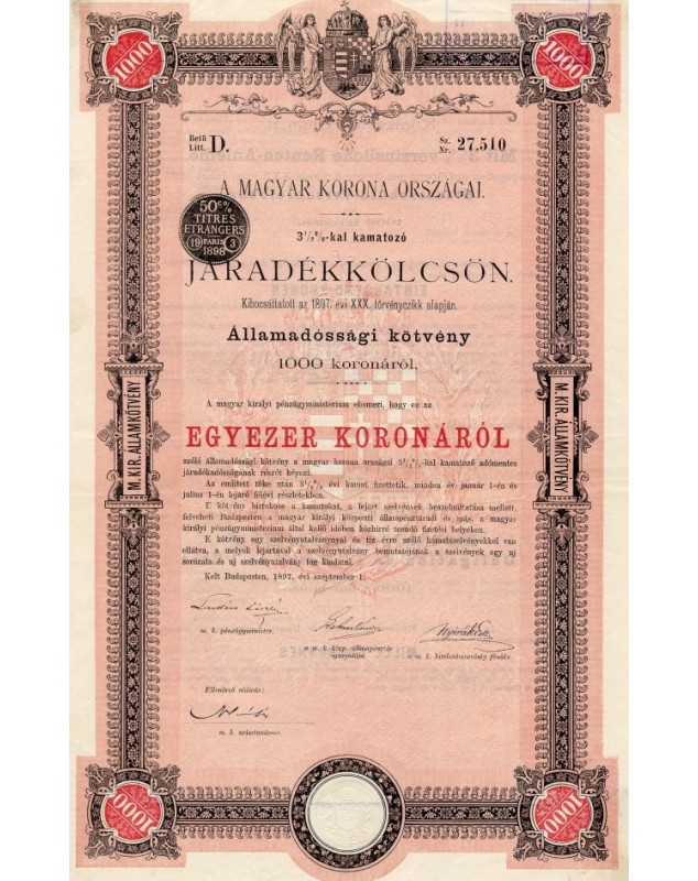 Royaume de Hongrie - Emprunt 3,5% 1897, 1000 Kr