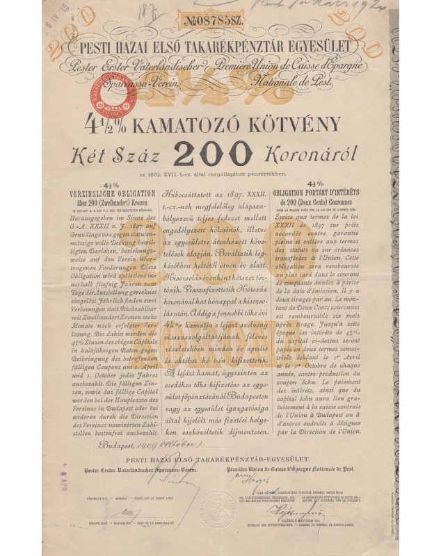 Première Union de Caisse d'Epargne Nationale de Pest - 4,5% 200Kr