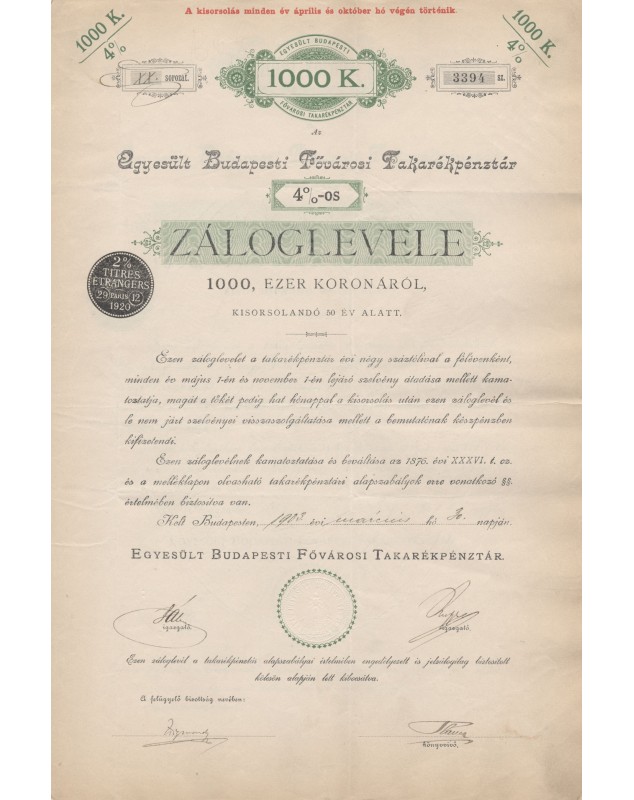Banque d'Epargne de Budapest - 4% 1000Kr