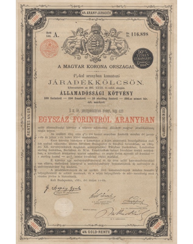 Royaume de Hongrie - Emprunt Or 4% 1881, 100 Fl.