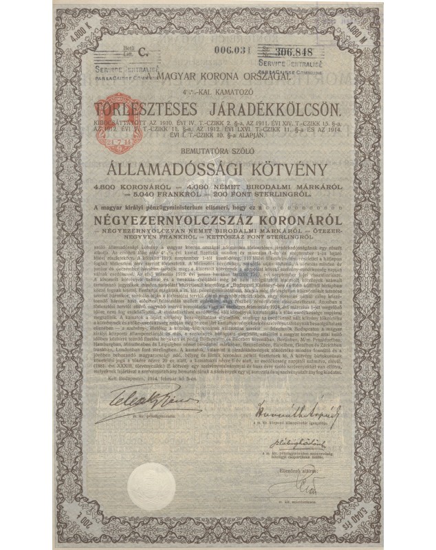 Obligation au porteur de 4.800 Couronnes ou 200£ ou 5.040 francs ou 4.080 Marks émise à Budapest en 1914.