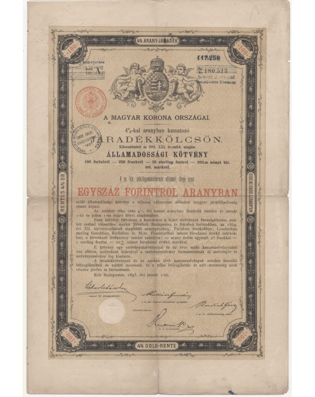 Royaume de Hongrie - Emprunt Or 4% 1893, 100 Fl.