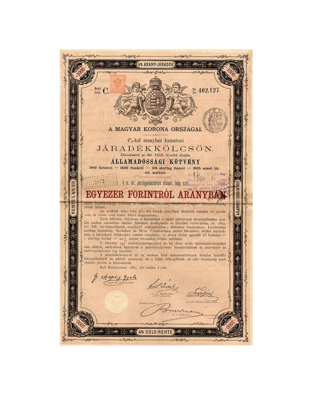 Royaume de Hongrie - Emprunt 4% Or 1881, 1000 Fl