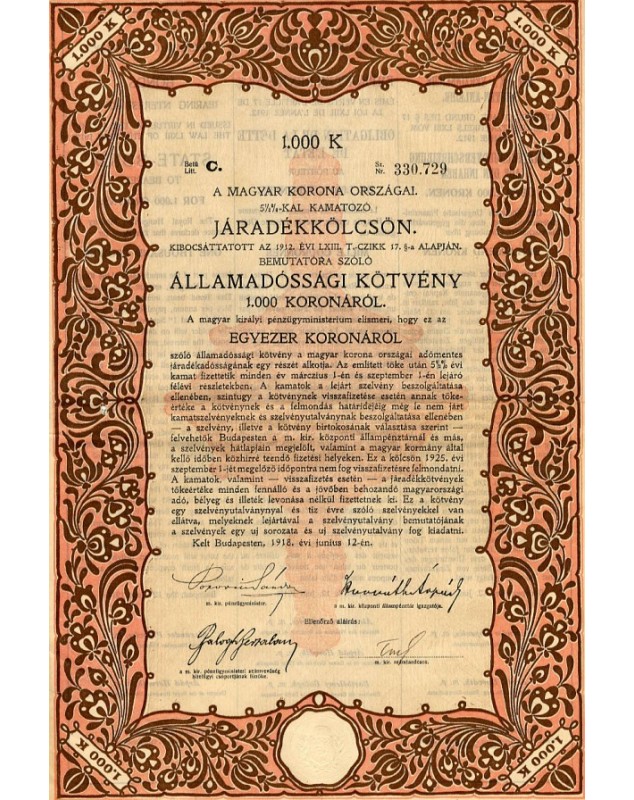 Obligation de 1000 Couronnes au porteur au taux de 5,5% émise à Budapest en 1918.