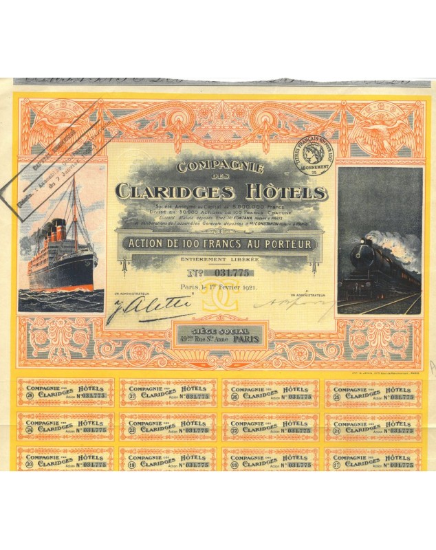 Action de 100 francs au porteur émise à Paris en 1919, avec tampon de remboursement de capital daté de 1925.