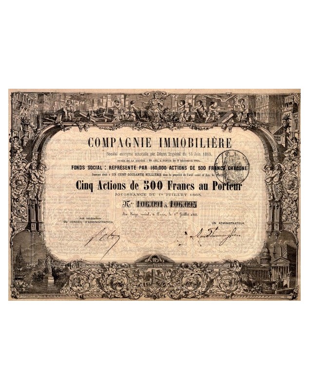 Titre de 5 actions de 500 francs au porteur émis à Paris en 1863.