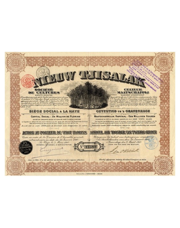 Action au porteur de 20 Florins émis à La Haye en 1910, avec tampon de 1936 de réduction de sa valeur à 8 Florins.
