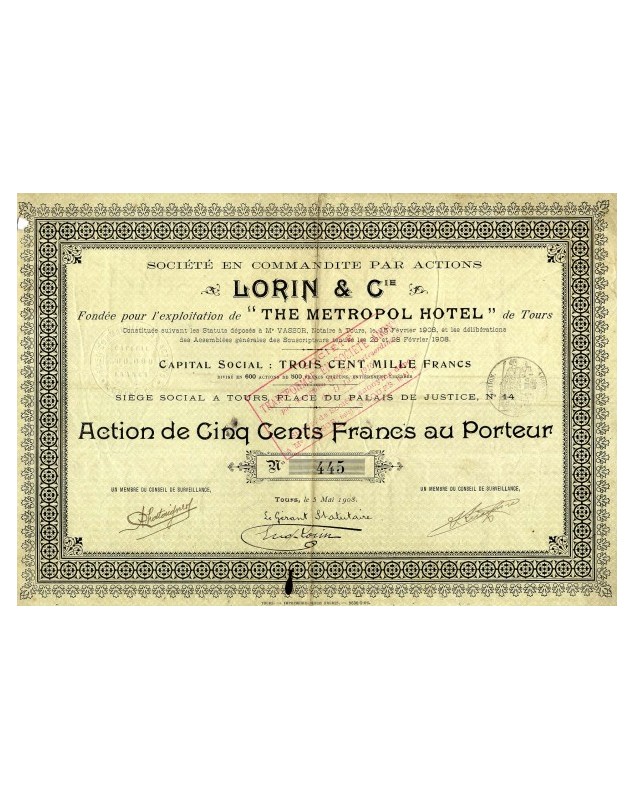 Action de 500 francs émise à Tours, Place du Palais de Justice, en 1908.