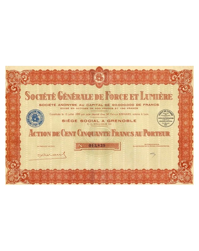 Action de 150 francs au porteur émise à Grenoble en 1932.
