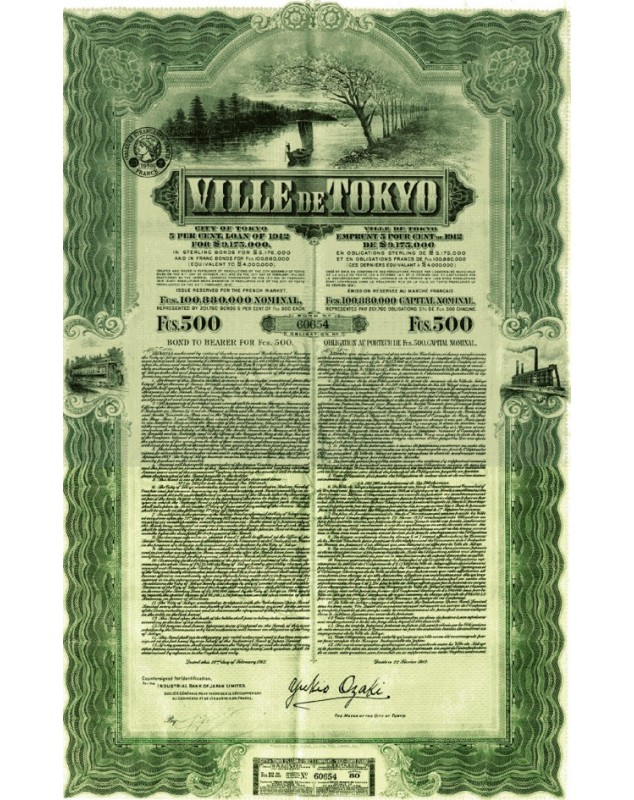 Obligation de 500 francs au porteur émise à Tokyo en 1912.