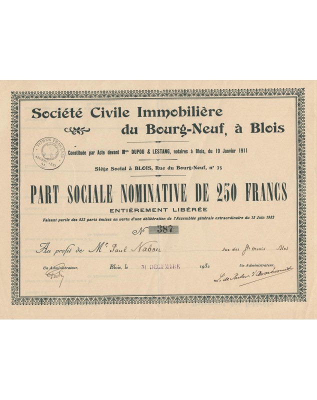 Part Sociale nominative de 250F - Blois 1932