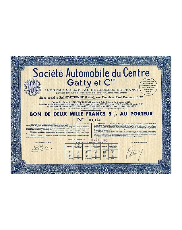 Bon de 2000 francs à 5% au porteur émis à Saint-Etienne en 1942.