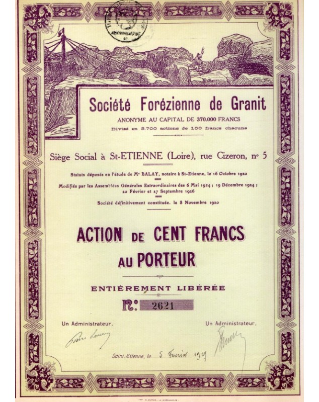 Action de 100 francs au porteur émise à Sant-Etienne en 1927.