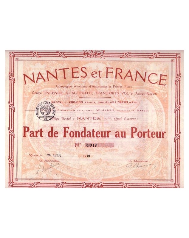 Part de Fondateur au porteur émise à Nantes en 1919.