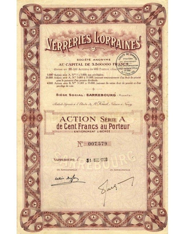 Action de 100F Série A - Sarrebourg (Moselle) 1928