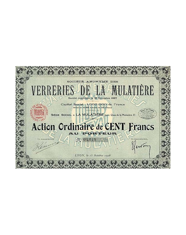 Action Ordinaire de 100 francs au porteur émise à Lyon en 1928.