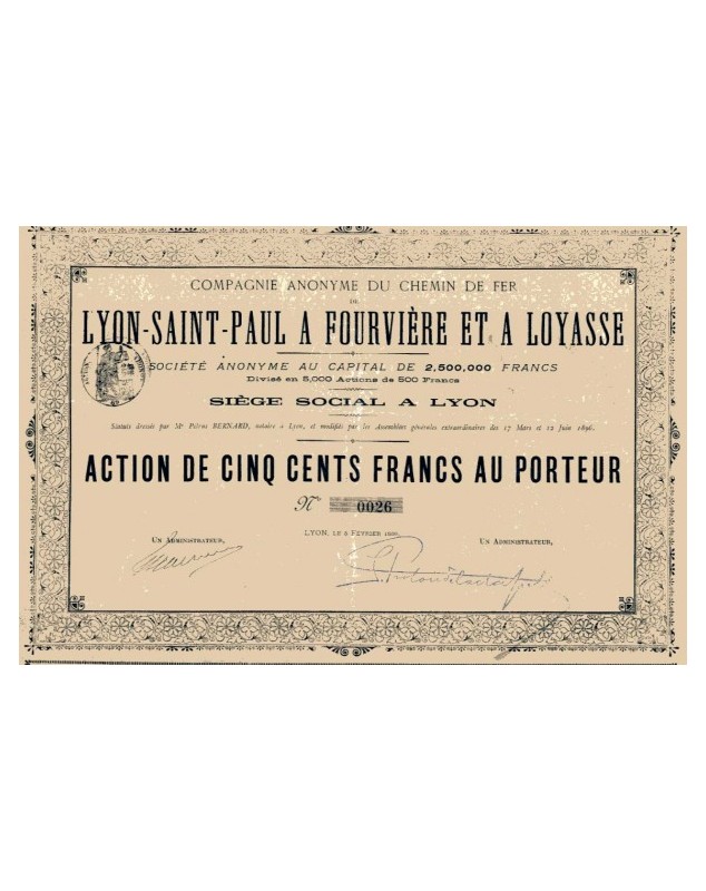 Action au porteur de 500 francs émise à Lyon en 1899, faisant partie d'une émission de 5.000 actions au capital.