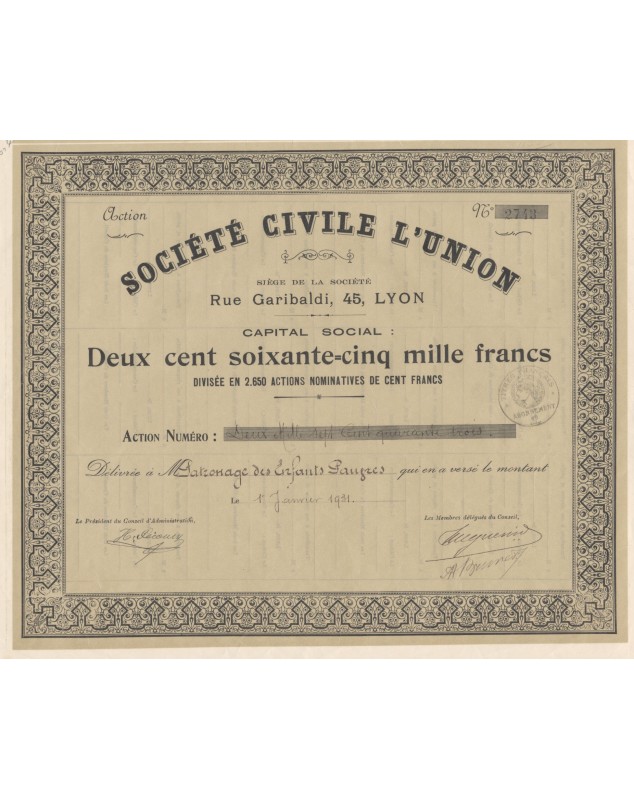 Propriétaire du Temple Maçonnique 45, Rue Garibaldi (anciennement rue Ste-Elisabeth) à Lyon.