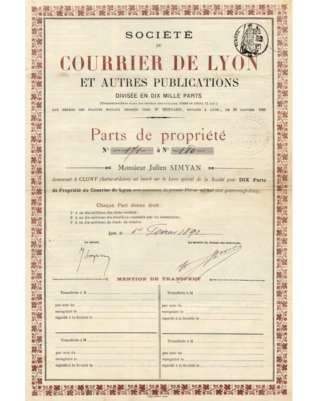 Certificat de 10 Parts de propriété nominative - Lyon 1892