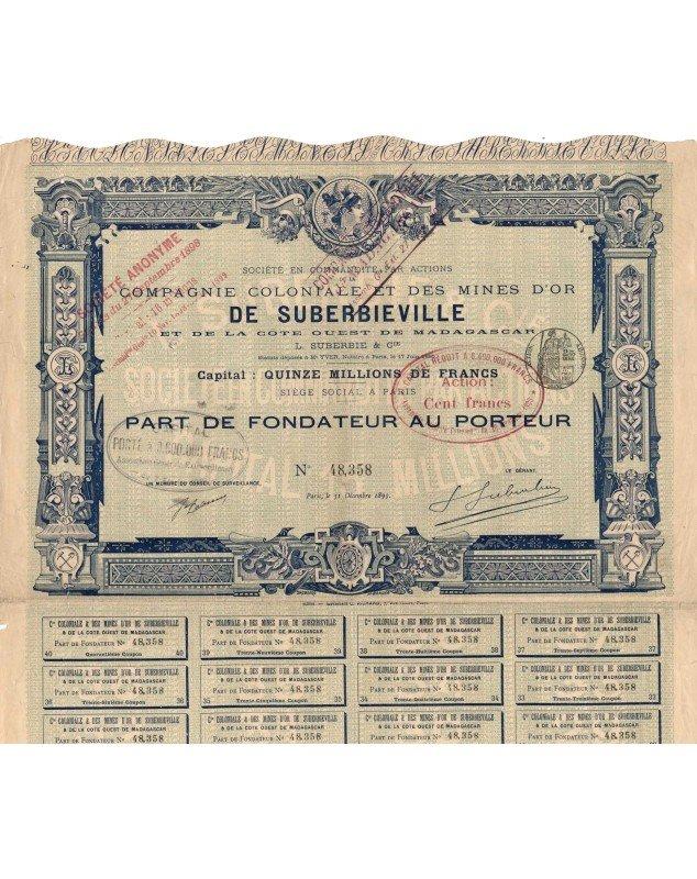 Société fondée en 1895 par le Francais Léon Suberbie, qui fut Consul Général de Madagascar à Paris. Signature originale sur le titre.