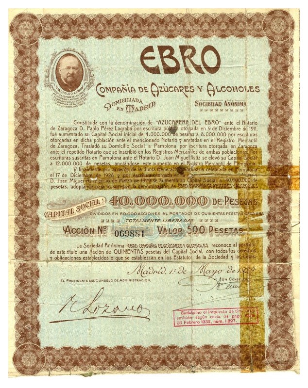 La Sté est fondée par Leopoldo Lewin (en médaillon sur le titre) sur les rives de l'Ebre. L'usine est installée à Saragosse.