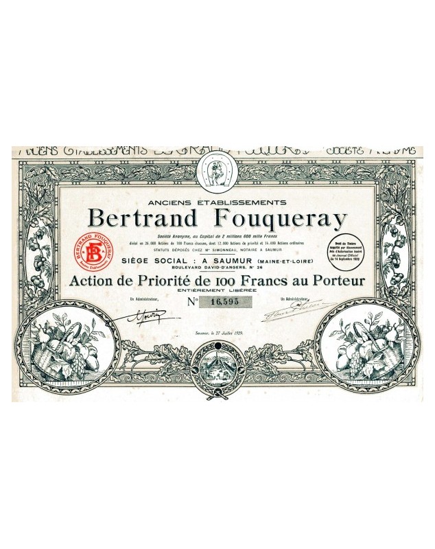 Action de Priorité de 100 francs émise à Saumur en 1929.