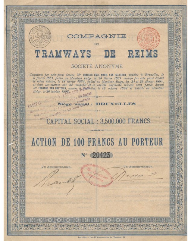 Société au Capital de 3.500.000F. Le siège social était situé à Bruxelles et le siège administratif à Reims.