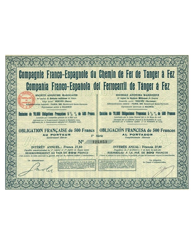 Obligation 5,5% de 500 francs émise à Meknès, Maroc en 1919.