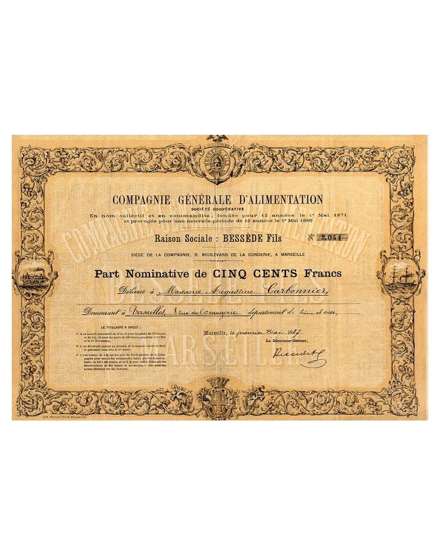 Part Nominative de 500 francs émise à Marseille en 1887.