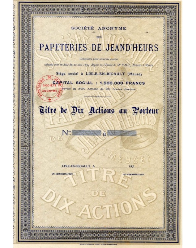 Titre de 10 Actions de 500F - Lisle-en-Rigault 1920