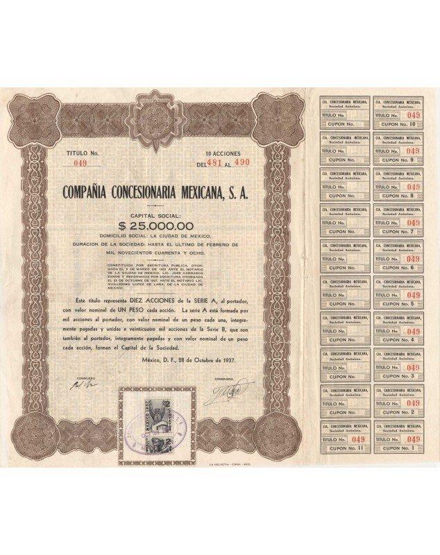 Titre de 10 actions d'1 Peso chacune - Mexico 1937