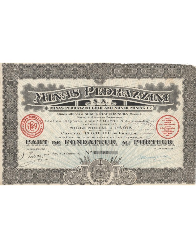 Minas Pedrazzini S.A. - Mines d'or et d'argent. 1921
