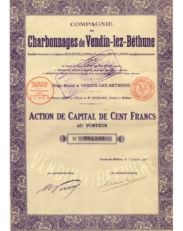 Action de capital de 100F - Vendin-lez-Béthune 1928