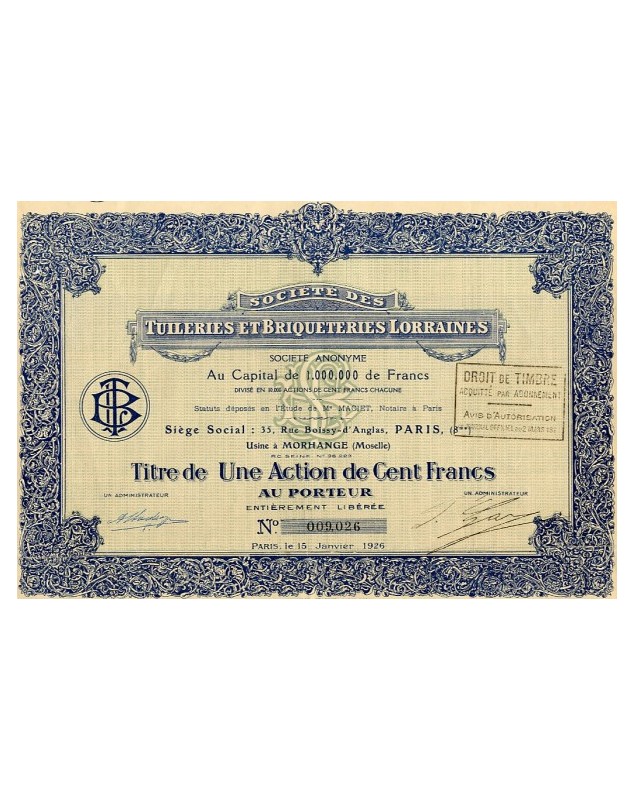 Titre de 1 action de 100F - Paris/Usine à Morhange 1926