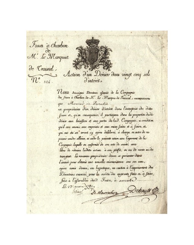 Rare document authentique historique (émission 300 actions seulement) sur une des plus anciennes mines de charbon. Le charbon fut découvert à Aniche en 1778.