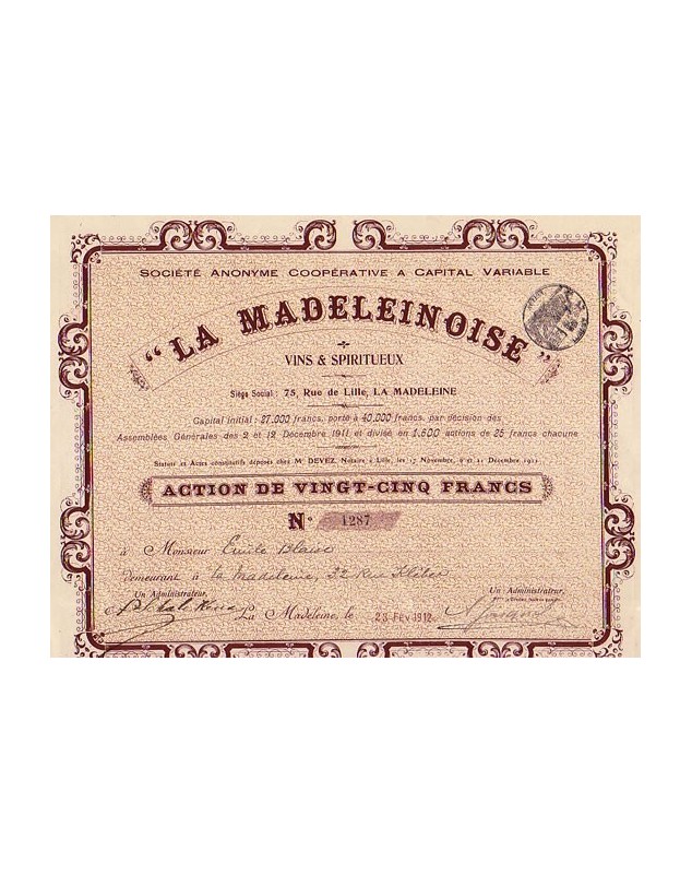 Action au porteur de 25 francs émise à La Madeline en 1912.