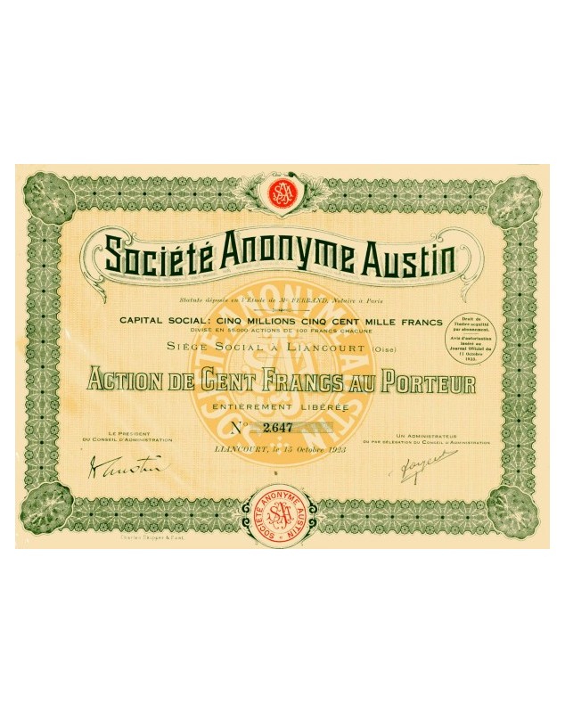 Austin devenant particulièrement populaire en France, pour contourner le problème des droits d'importation élevés imposés par le gouvernement français, la firme décide d'y ouvrir une usine à Liancourt dans la région de l'Oise au nord de Paris en rachetant le domaine de la Rochefoucauld.