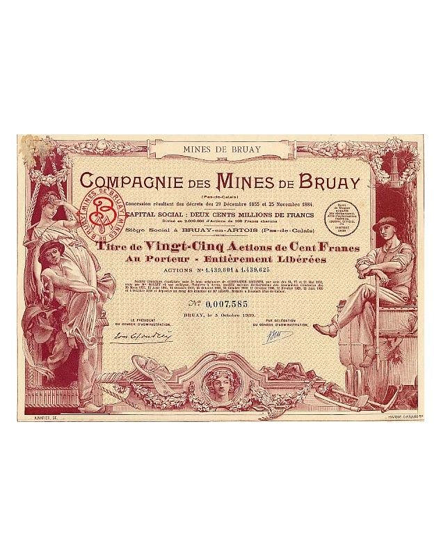 Titre de 25 Actions de 100F - Bruay-en-Artois 1939