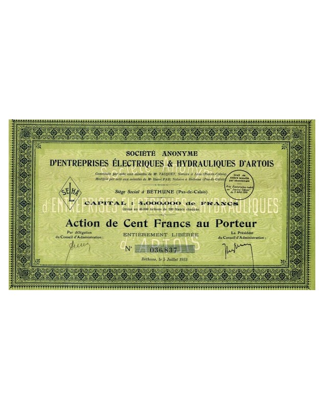 Action de 100 francs au porteur émise à Béthune en 1933.