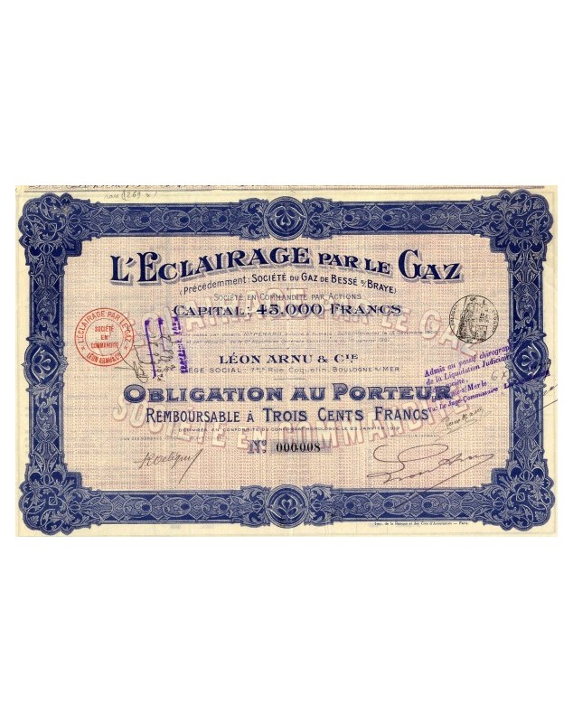 Obligation de 300 francs au porteur émise à Boulogne-sur-Mer (siège social rue Coquelin) en 1912.