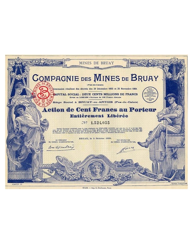 Action au porteur de 100 francs émise à Bruay-en-Artois en 1939.