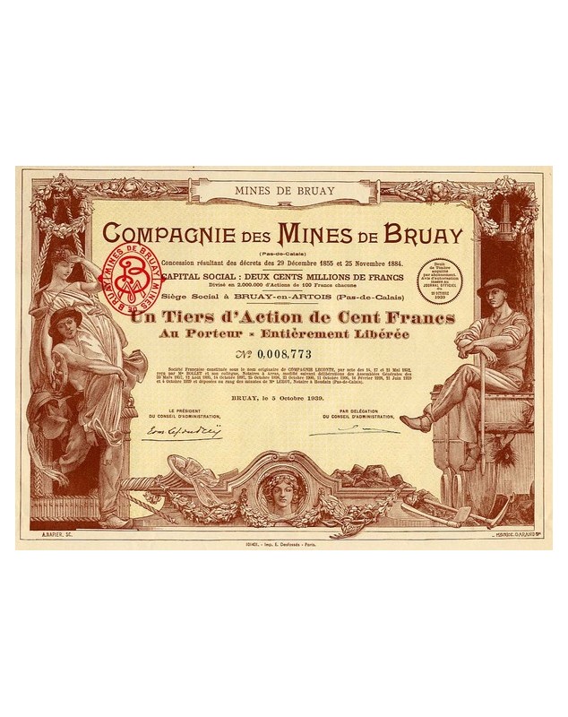 Tiers d'action au porteur de 100 francs émise à Bruay-en-Artois en 1939.