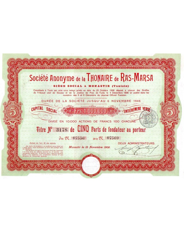 Titre de 5 Parts de Fondateur - Monastir 1906