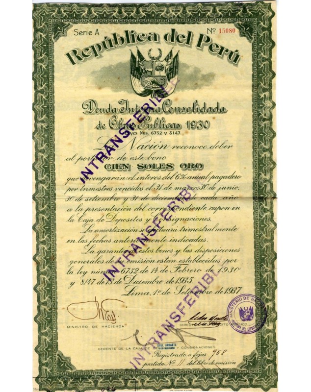 Republique du Pérou. Deuda Interna Consolidada 1930